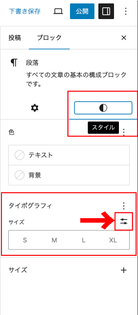 文字サイズを大きくする方法 WordPress 2025.10.23 このガイドではワードプレスの投稿機能を使用して文字サイズを大きくする方法について説明します。 ブロックエディターの場合 まず、文字サイズを変更したいブロック(段落)をクリックして選択します。 次に左メニューから赤丸のスタイルボタンを選択し、「タイポグラフィ」内の「フォントサイズ」でサイズを選択します。赤矢印のボタンを押すと1px単位でサイズが指定できます。
